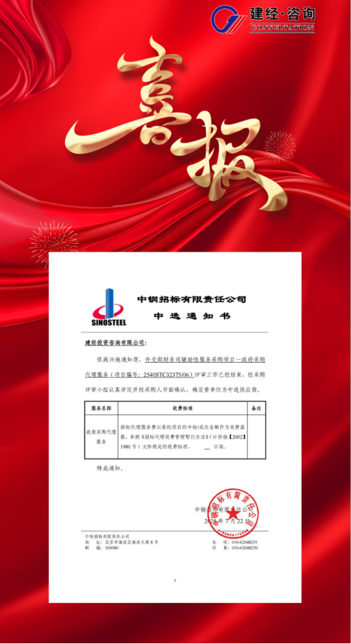 In foreign affairs, norms are the primary principle. Professionalism is the key support for government affairs security. Recently, Jianjing Investment Consulting Co., LTD. (hereinafter referred to as Jianjing Consulting) was successfully selected for the government procurement agency service project of the Ministry of Foreign Affairs, thanks to its years of professional accumulation in the field of government procurement, full-process compliance control capabilities and experience in serving major projects. This selection result is not only a high recognition of the professional strength of Jianjing Consulting by the Ministry of Foreign Affairs, but also marks a crucial step for the company in serving the country's major strategies and assisting in the upgrading of government services, injecting new connotations into the fulfillment of the corporate mission of "establishing achievements and benefiting the world and the people".